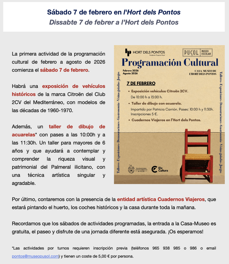 Dentro de las actividades programadas por el Hort dels Pontos, el sábado 7 de febrero iremos allí a dibujar. A las 10.00 h.