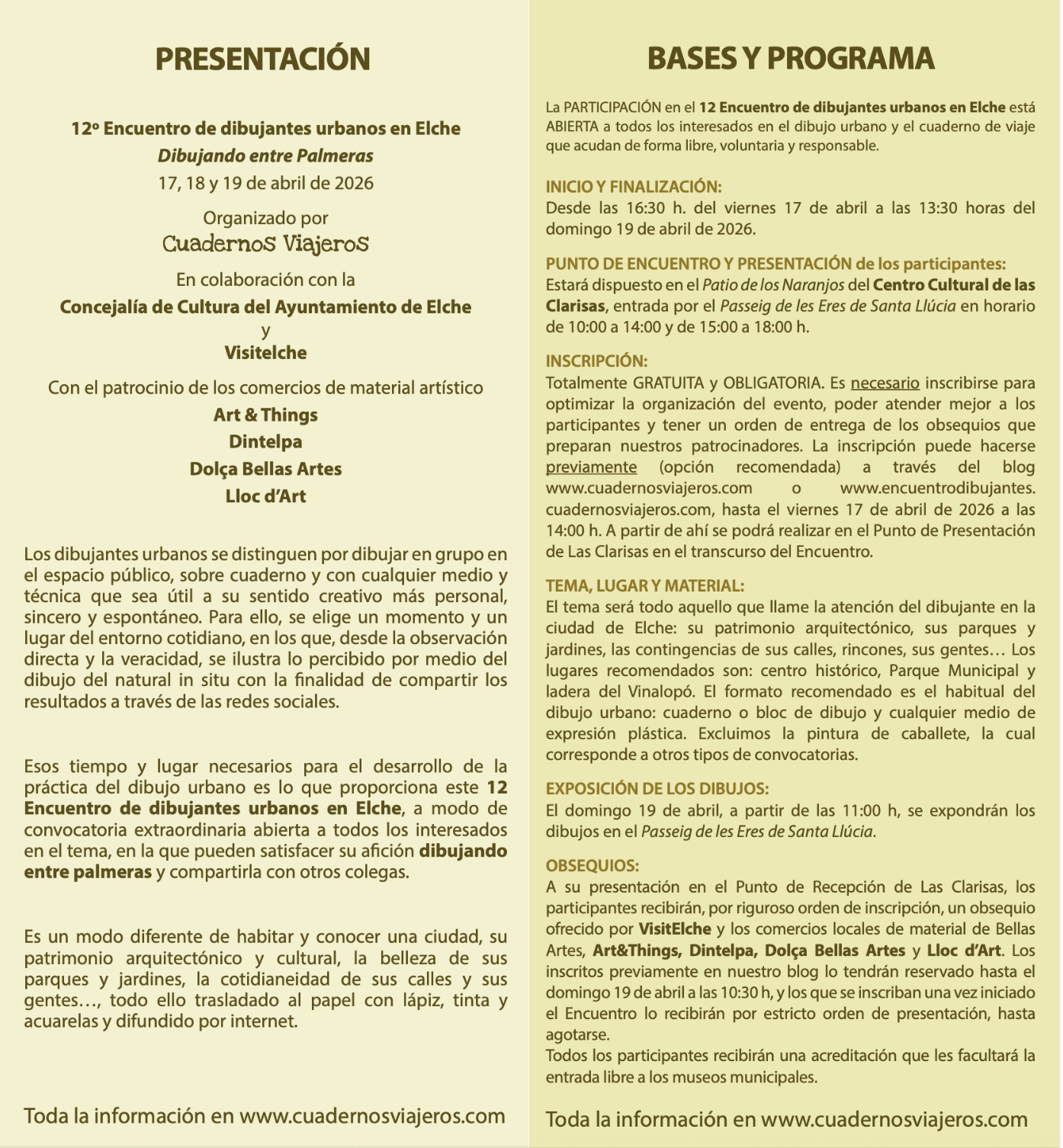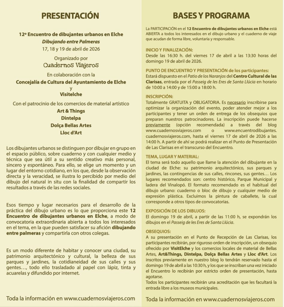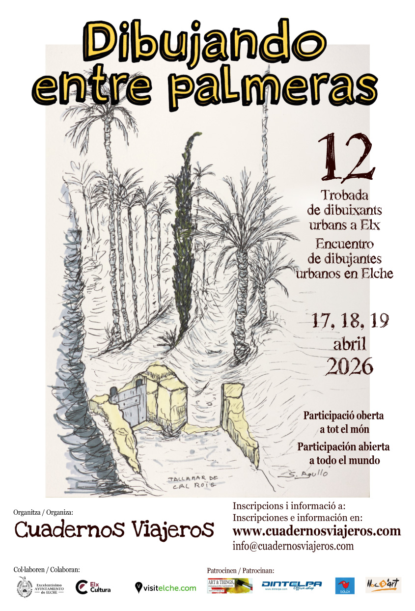 Abierta la inscripción GRATUITA para participar en la duodécima edición de Dibujando entre Palmeras. 17, 18 y 19 de abril, 2026. En www.cuadernosviajeros.com, y también en www.encuentrodibujantes.cuadernosviajeros.com